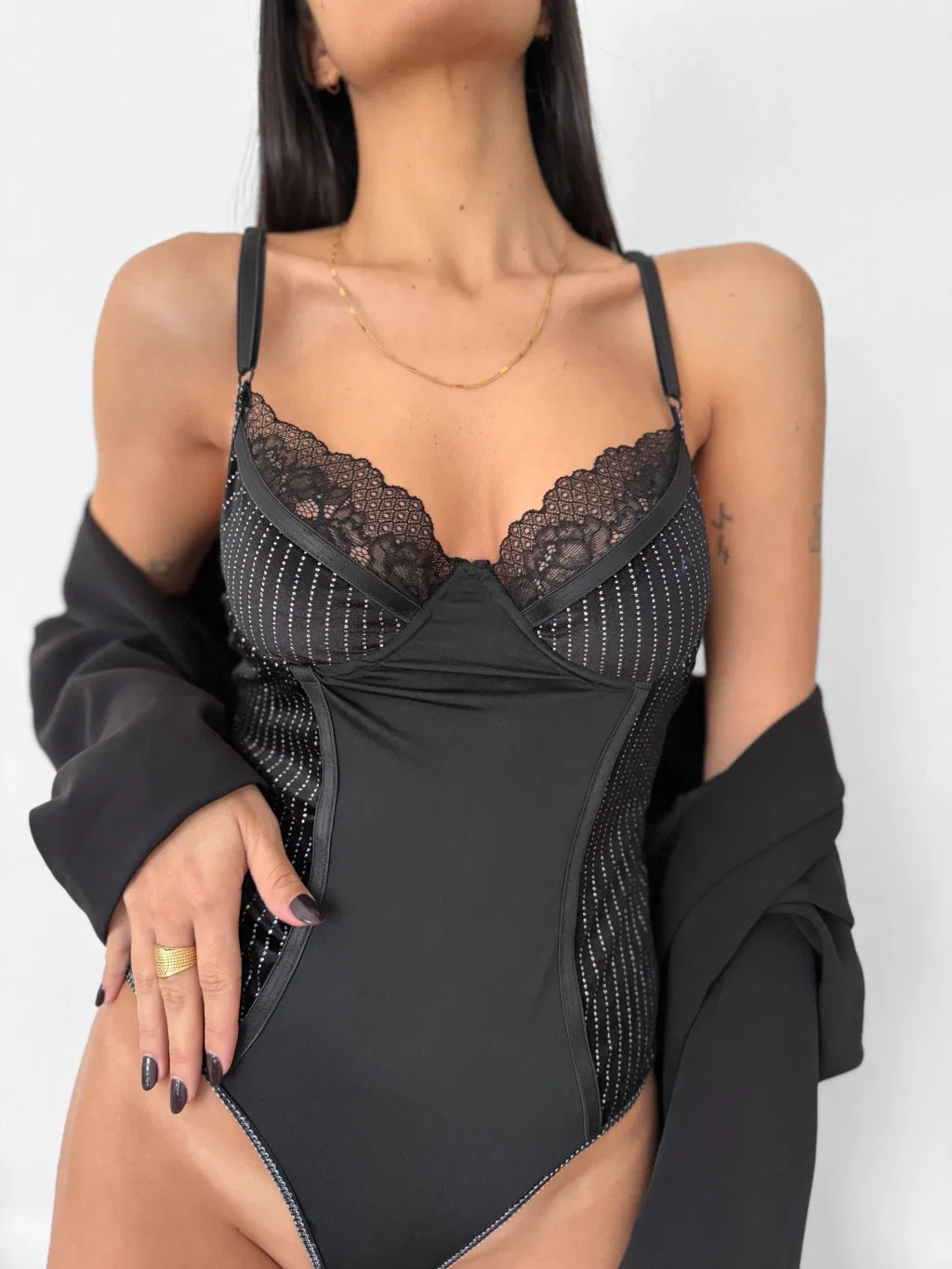 Body de microfibra , strass y puntilla.