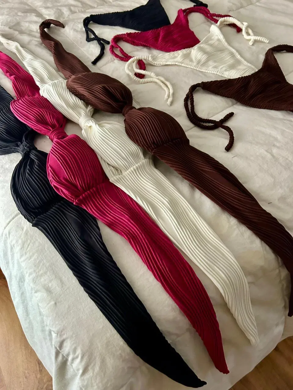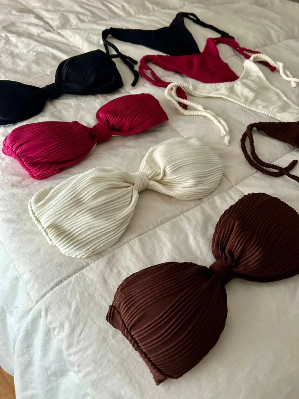 Bikini de lycra texturada importada. Corpiño strapeless con detalle de nudo y colaless en juego para atar.