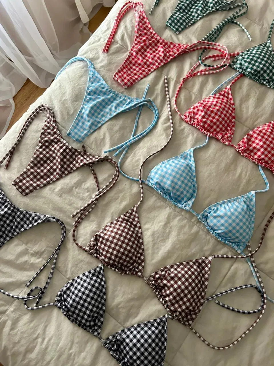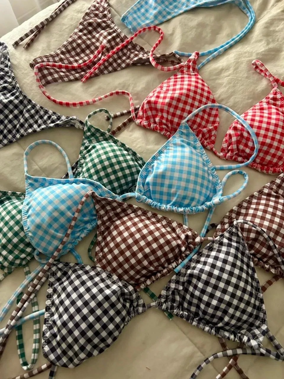Bikini de lycra sublimada. Corpiño triangulito con tazas y colaless para atar.