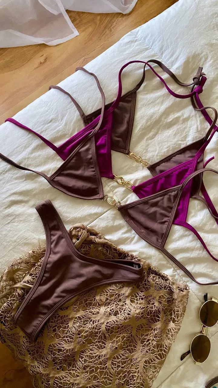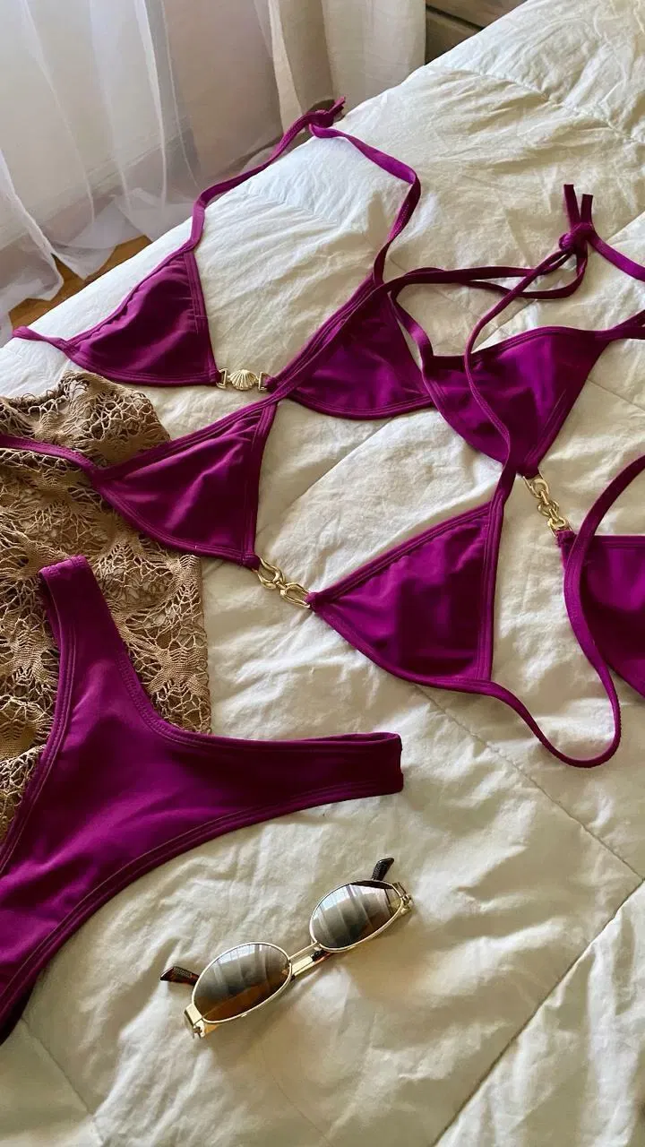 Bikini de lycra tricot. Corpiño con detalle de avío dorado y colaless en v tiro alto.