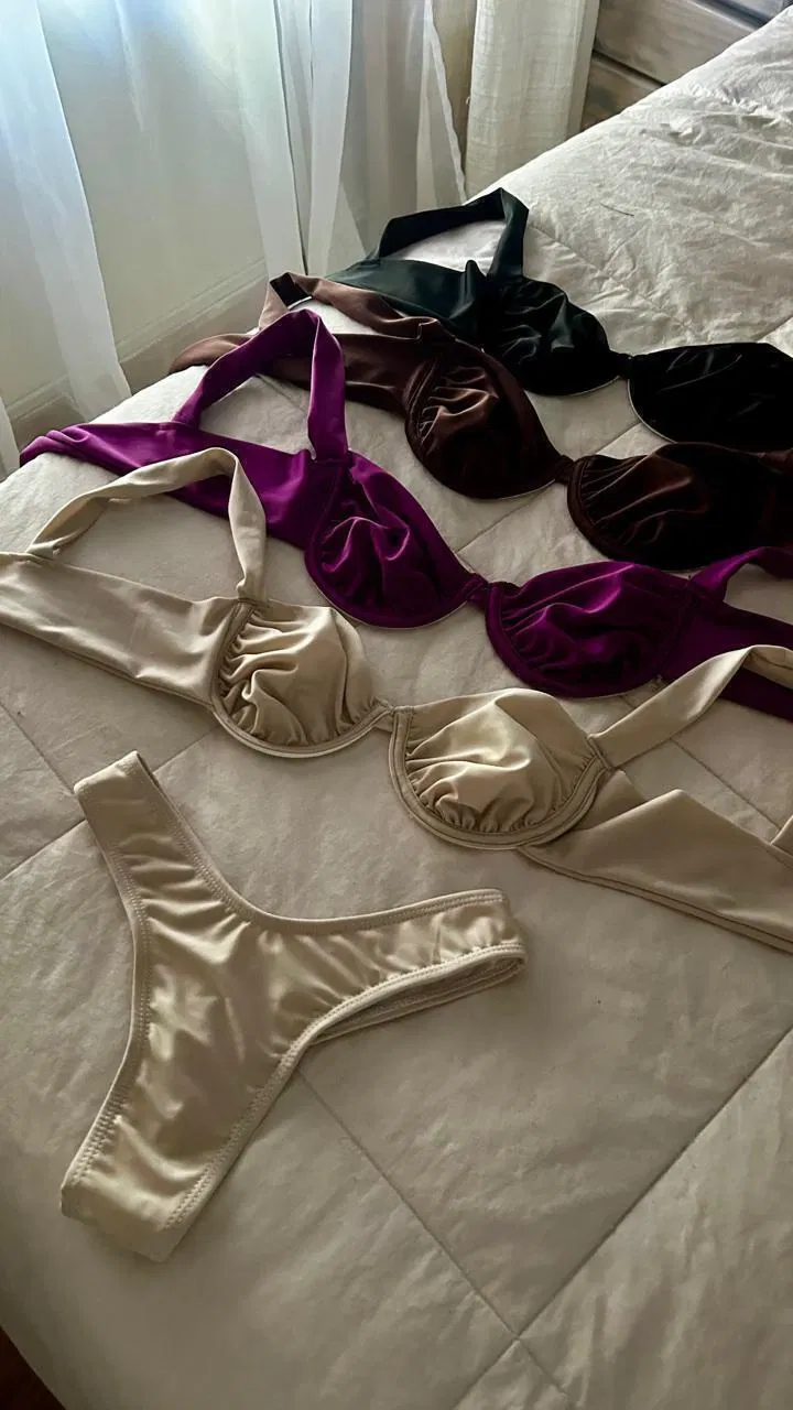 Bikini de lycra. Corpiño con aro y efecto arrugado, breteles enchos y espalda para atar. Bombacha colaless a juego.